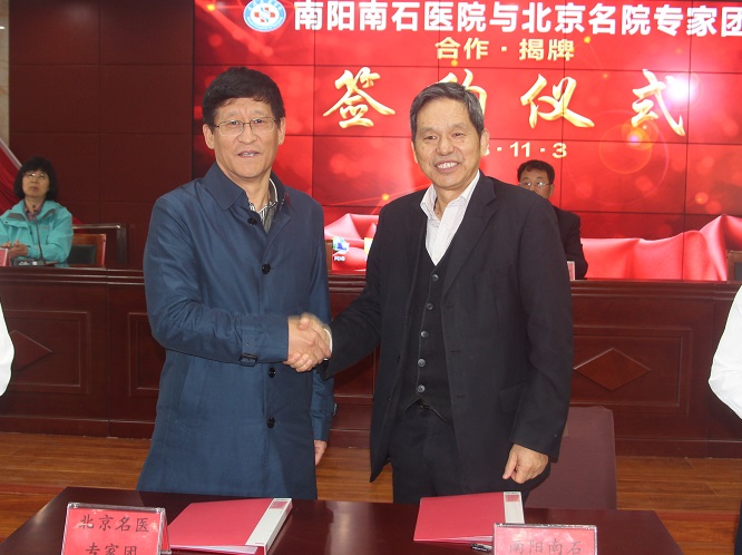 南石醫(yī)院與北京名院專(zhuān)家團(tuán)簽約現(xiàn)場(chǎng) □本報(bào)記者 郭東里 通訊員 李春曉 文/圖 一湖丹江水,連接京宛情。11月3日,南石醫(yī)院迎來(lái)了北京12位名家大腕到院坐診,推開(kāi)了北京向南陽(yáng)輸出優(yōu)質(zhì)醫(yī)療資源的序幕。今后,每周六、周日,都會(huì)有北京專(zhuān)家到南石醫(yī)院坐診。 上午8點(diǎn)30分,南石醫(yī)院與北京名院專(zhuān)家團(tuán)合作簽約儀式正式舉行,南陽(yáng)市衛(wèi)計(jì)委有關(guān)領(lǐng)導(dǎo)出席會(huì)議并作重要講話(huà)。 南石醫(yī)院與北京名院專(zhuān)家團(tuán)的合作簽約,是為響應(yīng)國(guó)務(wù)院辦公廳《關(guān)于推進(jìn)分級(jí)診療制度建設(shè)的指導(dǎo)意見(jiàn)》,讓南陽(yáng)老百姓在家門(mén)口就能享受京城名院專(zhuān)家精湛、優(yōu)質(zhì)的醫(yī)療技術(shù)服務(wù),降低百姓找北京專(zhuān)家就醫(yī)的成本。 簽約儀式結(jié)束后,12名北京大腕專(zhuān)家分頭到各個(gè)診室坐診,提前預(yù)約的患者排成長(zhǎng)龍等待,涉及的專(zhuān)業(yè)有胸外科、風(fēng)濕免疫科、普外科、呼吸內(nèi)科、口腔科、內(nèi)分泌科、腫瘤內(nèi)科、神經(jīng)內(nèi)科、重癥醫(yī)學(xué)科、婦產(chǎn)科、骨科等。